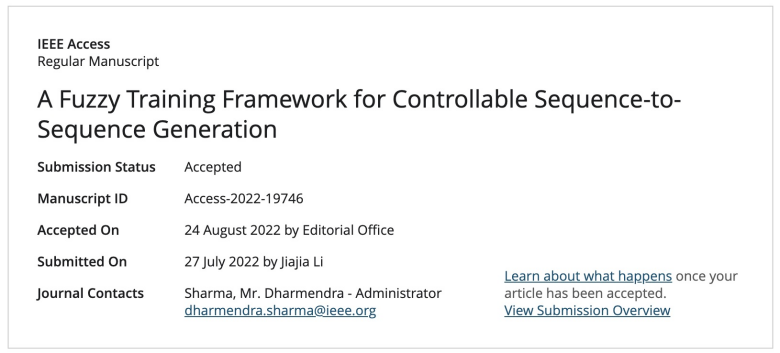 近日,我校音乐学院青年教师李佳佳在国际权威期刊《IEEE Access》(SCI索引,中科院二区Top,影响因子: 4.34)上发表题为“A Fuzzy Training Framework for Controllable Sequence-to-Sequence Generation”的研究论文,实现了我校在该国际顶级期刊上新的突破!