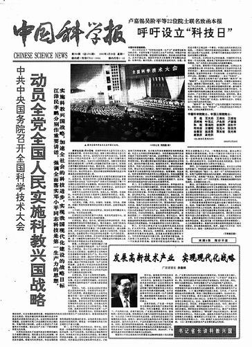 1995年5月6日,中共中央、国务院作出《关于加速科学技术进步的决定》,提出科教兴国战略。5月22日,《人民日报》发表了《关于加速科学技术进步的决定》的全文。5月26日至30日,中共中央、国务院在北京召开全国科学技术大会,江泽民总书记和李鹏总理发表重要讲话。正如新华社当时的报道指出:“这次大会是继1956年党中央发出‘向科学进军’的伟大号召并制定了第一个长期的全国科学技术发展规划,和1978年党中央召开的全国科学大会之后,我国科技发展史上的又一次重要会议。这次会议对促进我国科技、经济和社会发展将产生重大影响。”